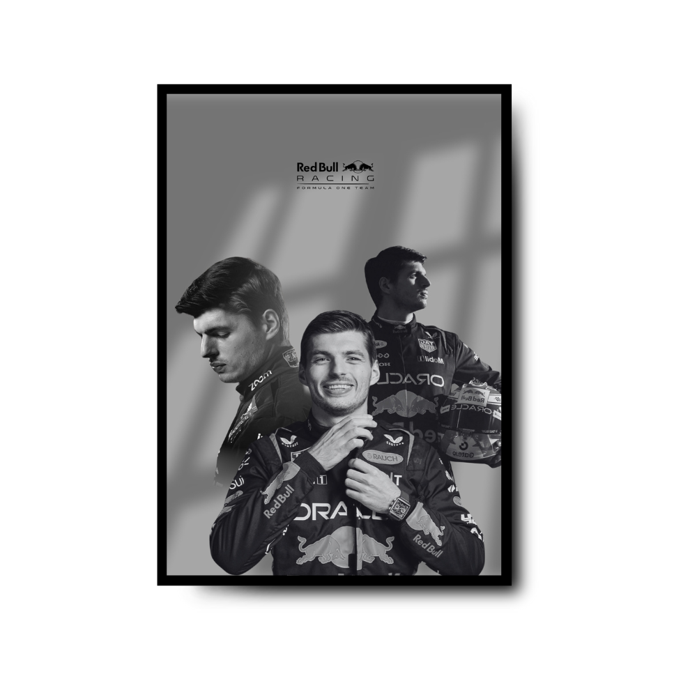 Elegancja, dynamika i mistrzowski charakter – to wszystko zamknięte w jednym plakacie przedstawiającym Maxa Verstappena, kierowcę zespołu Red Bull Racing. Trzy ujęcia, jeden bohater i ponadczasowy styl w czarno-białej tonacji – idealny wybór dla prawdziwych fanów Formuły 1.
